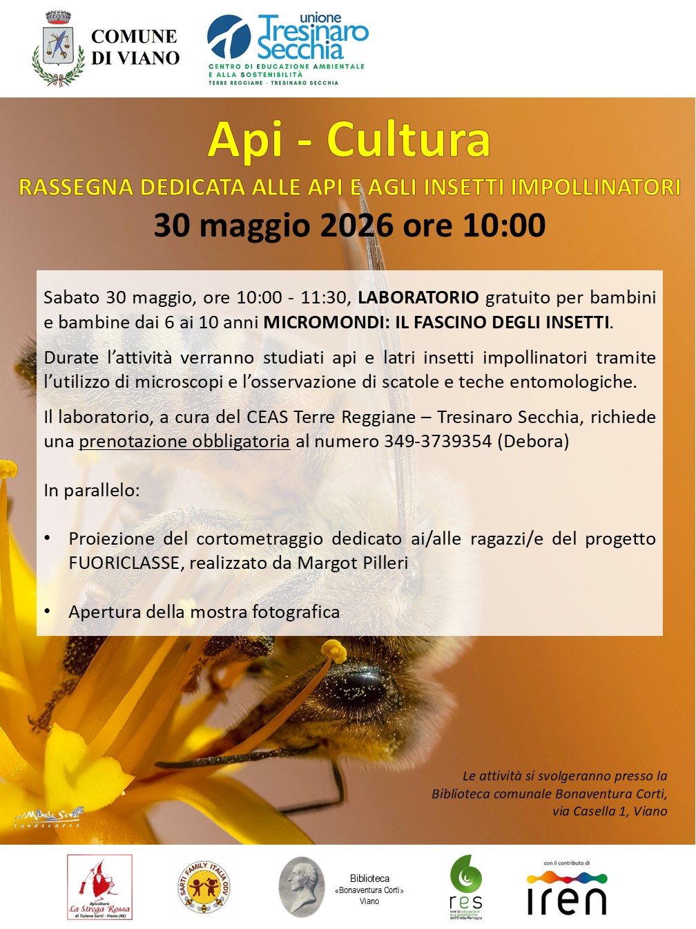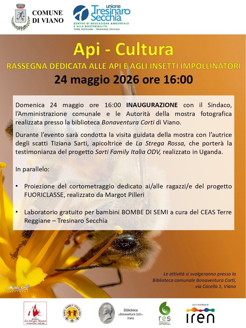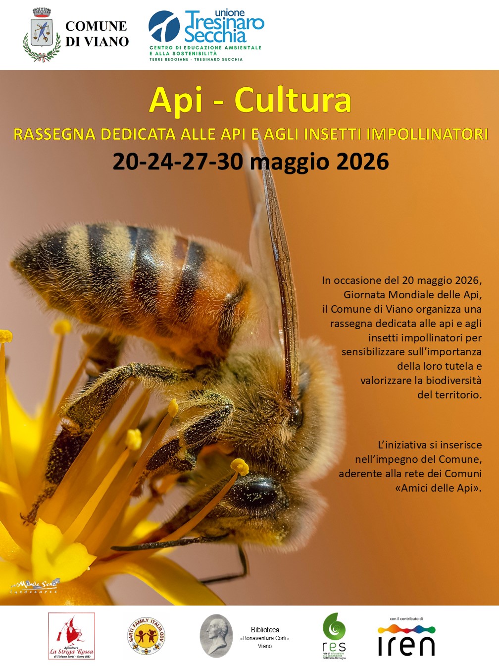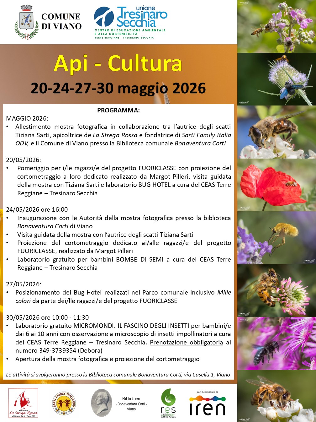 In occasione della Giornata Mondiale delle Api (20 maggio), il Comune di Viano organizza una rassegna dedicata alle api e agli insetti impollinatori