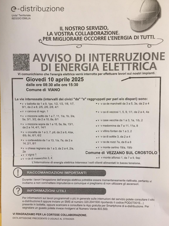 Vi comunichiamo che Giovedì 10 Aprile 2025 dalle ore 8.30 alle ore 15.30 l'energia elettrica verrà interrotta per effettuare lavori sugli impianti.