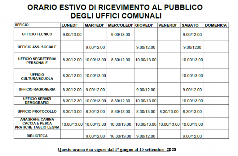 Orario estivo in vigore dal 1 giugno al 15 settembre.