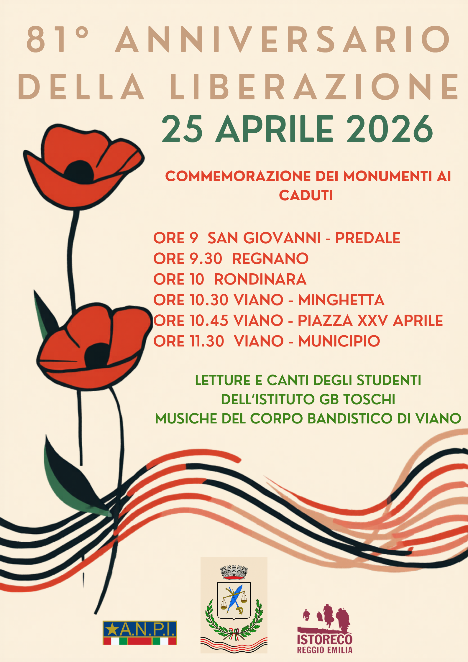 La manifestazione sarà accompagnata dal Corpo Bandistico di Viano in località Rondinara, Piazza XXV Aprile e presso il Municipio.
