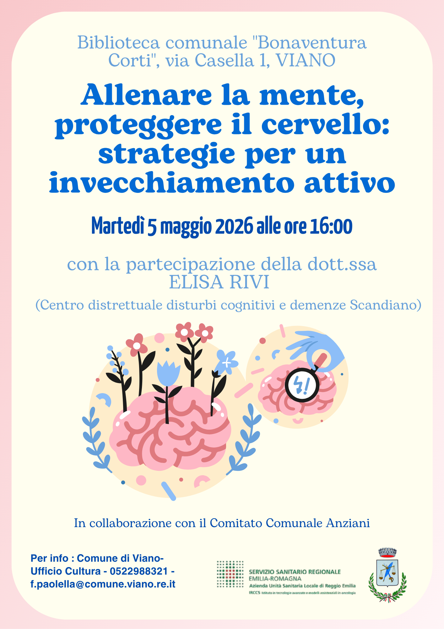 Martedi' 05/05 alle ore 16.00 presso la Biblioteca di Viano in Via Casella 1 incontro con la Dott.ssa Elisa Rivi (Centro distrettuale disturbi cognitivi e demenze di Scandiano) .