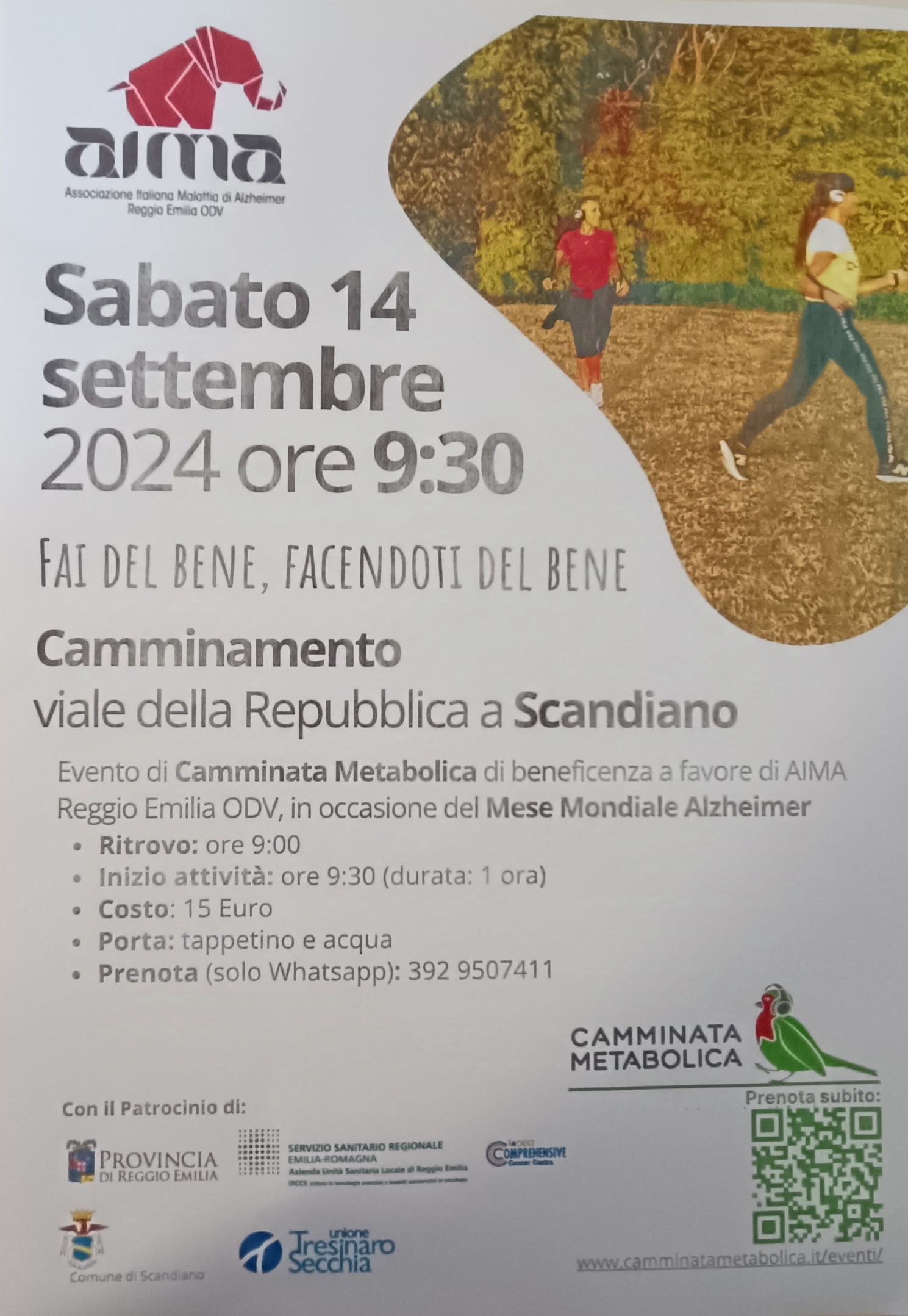 Sabato 14 settembre 2024 evento di Camminata Metabolica di beneficenza a favore di AIMA Reggio Emilia ODV, in occasione del Mese Mondiale Alzheimer.
