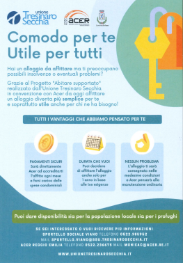 Grazie al Progetto "Abitare supportato" realizzato dall'Unione Tesinaro Secchiain convenzione con Acer da oggi affittare un alloggio diventa più semplice per te e soprattutto utile anche per chi ne ha bisogno!