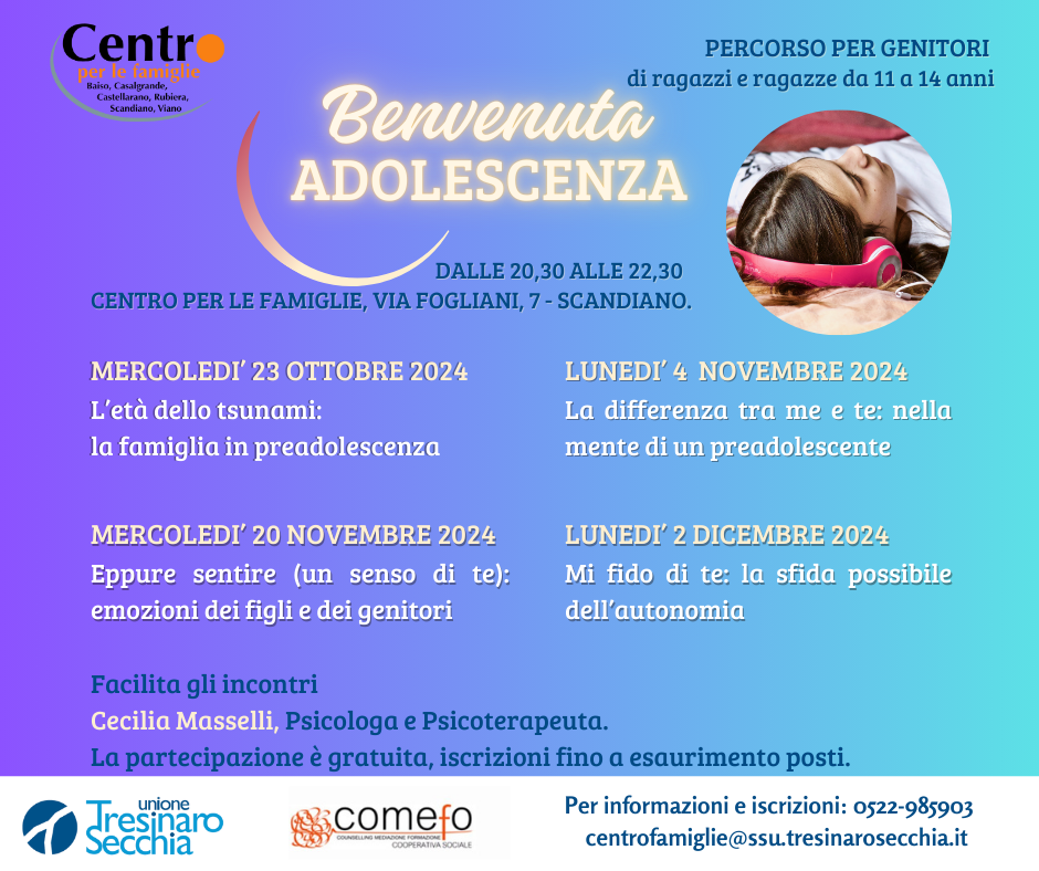 "Benvenuta Adolescenza" incontri di gruppo per genitori di ragazzi e ragazze da 11 anni a 14 anni.