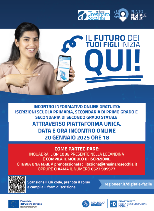 Partecipa all'incontro informativo gratuito organizzato dal Punto Digitale Facile dell'Unione Tresinaro Secchia per le iscrizioni scolastiche su piattaforma unica! L'iniziativa è rivolta a tutti i cittadini dei comuni dell'Unione Tresinaro Secchia. 👨‍👩‍👧‍👦💻