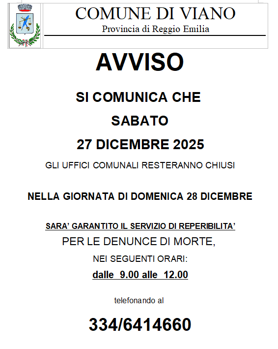 SABATO 27 DICEMBRE 2025 GLI UFFICI COMUNALI RESTERANNO CHIUSI ,NELLA GIORNATA DI DOMENICA 28 DICEMBRE SARA’ GARANTITO IL SERVIZIO DI REPERIBILITA' PER LE DENUNCE DI MORTE,