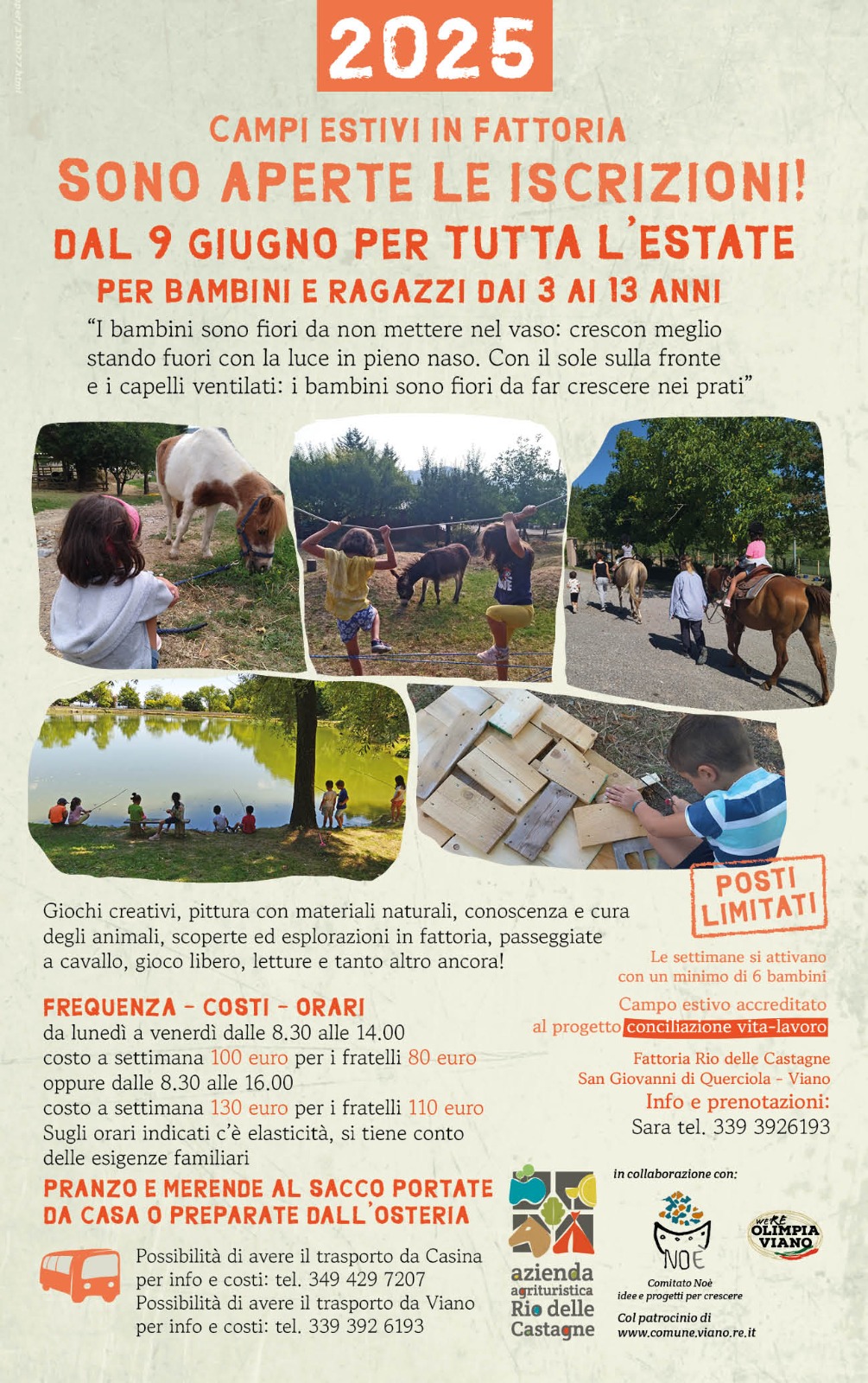 5. AZIENDA AGRITURISTICA “RIO DELLE CASTAGNE”, via Bertolini 13/a, Viano, denominazione centro estivo “CAMPI ESTIVI IN FATTORIA”, con sede operativa a Viano, in via Bertolini 13/a;