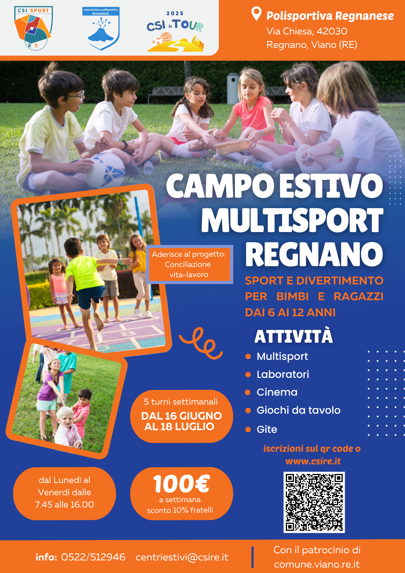 2.CSI SPORT REGGIO EMILIA S.S.D.A.R.L., via Vasco Agosti 4 Reggio Emilia,denominazione centro estivo “CAMPO ESITVO MULTISPORT REGNANO”, con sede operativa a Regnano,in via Chiesa 1