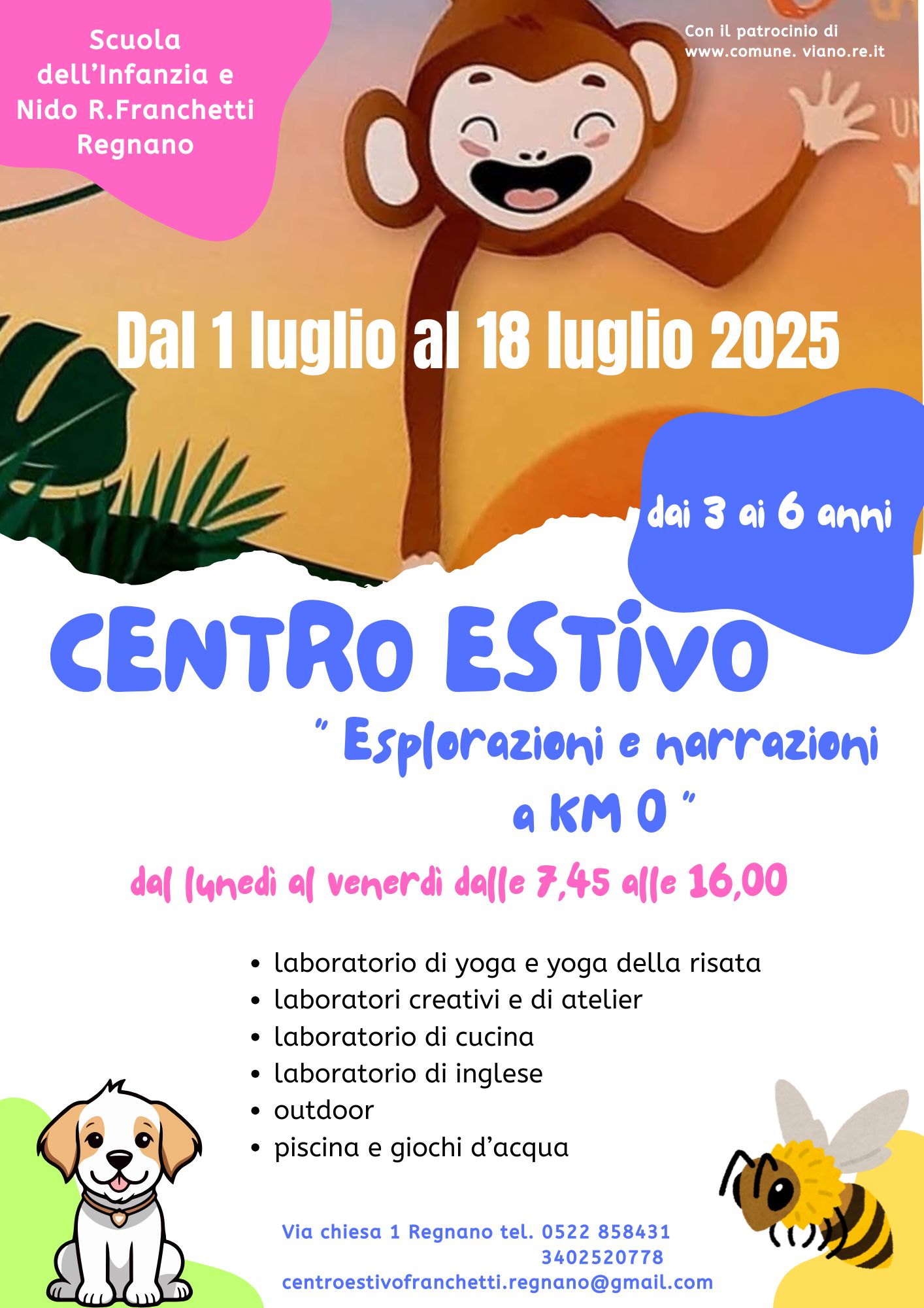 1. SCUOLA DELL'INFANZIA “R. FRANCHETTI” REGNANO, via Chiesa 1 Viano, denominazione centro estivo “ESPLORAZIONI E NARRAZIONI A KM 0”, con sede operativa a Regnano, in via Chiesa 1