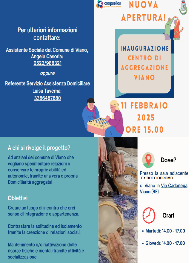 Assistente Sociale del Comune di Viano,Angela Casoria: 0522/988321 oppure Referente Servizio Assistenza Domiciliare Luisa Taverna: 3386487880
