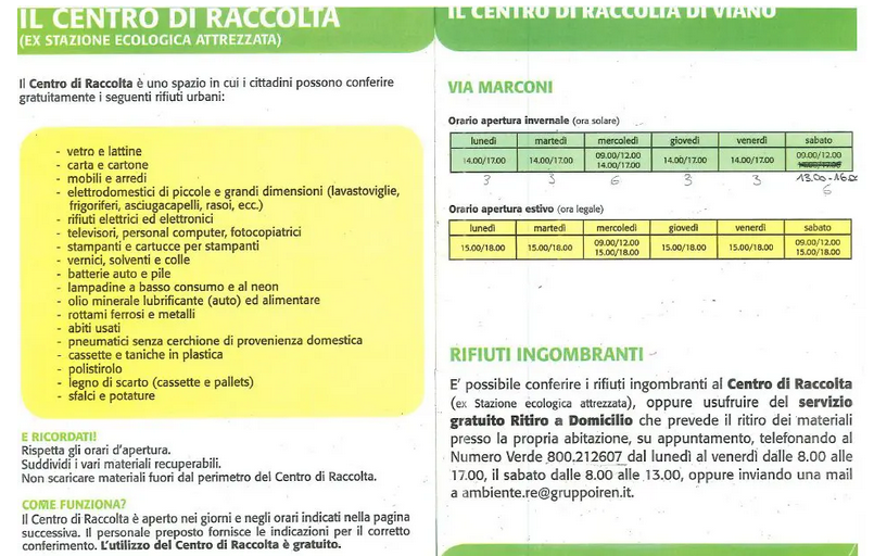 Il Centro di Raccolta di Via Marconi (zona artigianale di Viano) integra il servizio di raccolta capillarizzata al fine di avviare al riutilizzo una più ampia gamma merceologica di rifiuti.
